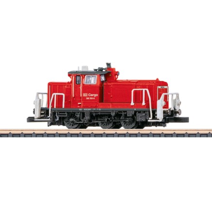 Die kleine Rangierlok der Baureihe 360 erscheint in verkehrsrot mit DB Cargo Logo im Zustand der späten 1990er Jahre.