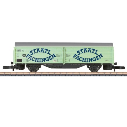 Dieser Schiebewandwagen ist eingestellt bei der Deutschen Bundesbahn und trägt die Beschriftung der Epoche 4 als Gattung Hbis-t299. Auf den Seitenwänden wirbt er für die Wassermarke Staatlich Fachingen.